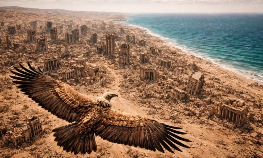 Busca con desesperación una ruta de escape entre los escombros. Intenta meterse dentro de algún agujero o grieta que le permita protegerse. Una sombra lo cubre y se escucha el chillido desgarrador…Continúa buscando refugio, corre por donde le es posible, los escombros crecen, los caminos se cierran, los escombros se levantan con cada paso que dá. Siente de nuevo una sombra justo detrás suyo. Se estremece y su cuerpo gira…un dolor indescriptible sale su cuerpo desgarrado en un instante por las afiladas garras de un ave; esta levanta su vuelo nuevamente con sus patas ensangrentadas. Está hambrienta pero quiere jugar antes de deborar a su presa.